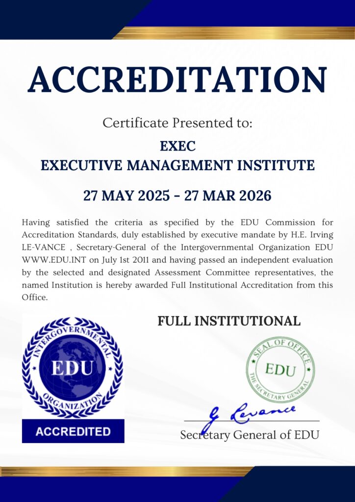 EXEC Toulouse est officiellement accréditée par l’organisation intergouvernementale EDU (www.edu.int). Cette accréditation a été délivrée conformément aux critères rigoureux définis par la Commission EDU pour les normes d’accréditation, établie par mandat exécutif du Secrétaire Général S.E. Irving LE-VANCE. Après une évaluation indépendante menée par un comité d’experts, EXEC Toulouse a obtenu la pleine accréditation institutionnelle.